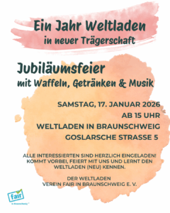 Der Weltladen Braunschweig feiert am Samstag, 17. Januar 2026, ein Jahr am neuen Standort in der Goslarschen Straße. Nachdem der Weltladen Anfang 2025 in die Trägerschaft des Vereins „Fair in Braunschweig“ e. V. übergegangen war, wurde der neue Standort am 16. Januar 2025 feierlich eröffnet. Seitdem wird der Weltladen von einem ehrenamtlichen Team geführt und als Ort für fairen Handel, Begegnung und Bildungsarbeit kontinuierlich weiterentwickelt. Aus Anlass des Jubiläums lädt der Weltladen ab 15 Uhr zu einer offenen Feier mit Waffeln, Getränken und Musik ein. Alle Interessierten sind herzlich willkommen.
